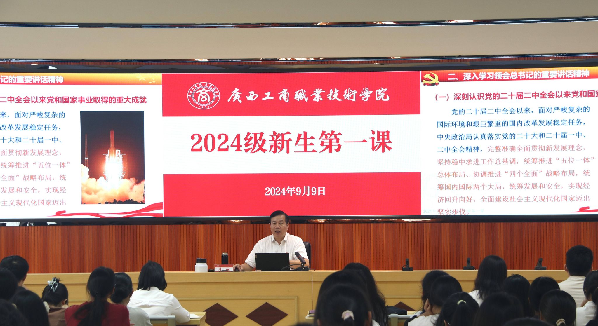 9月9日,学校开展2024级新生第一课学习教育活动,引导新生赓续红色血脉,切实担当起推动中华民族伟大复兴的历史使命。学校党委书记李维、校长刘进、党委副书记安仲文分别在鹏飞校区、武鸣校区、中尧校区为我校2024级新生讲授“开学第一课”。此次活动以“深入学习贯彻党的二十届三中全会精神”为主题,采取线下讲授、线上直播结合的形式展开。