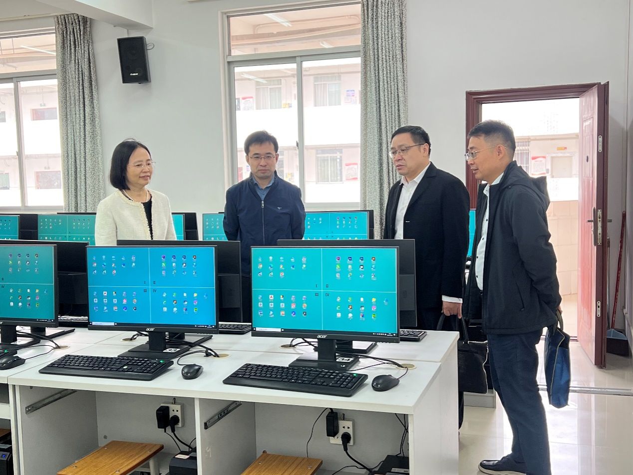 在韦云凤的陪同下,黄杨剑一行还参观了我校鹏飞校区计算机实训室,通过实地查看,详细了解了我校标准化考场建设进度及相关配套设施情况。