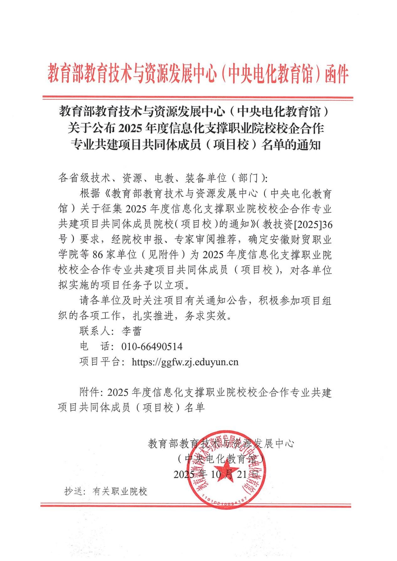 近日,教育部教育技术与资源发展中心(中央电化教育馆)公布2025年度“信息化支撑职业院校校企合作专业共建项目”共同体成员名单,经过严格的资格审查与专家评议,我校成功入选成为项目共同体成员。