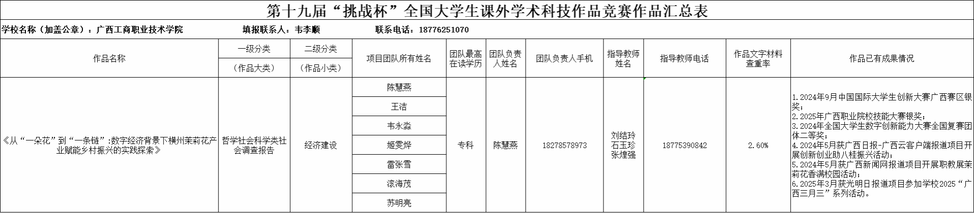 根据《关于组织开展第十九届“挑战杯”全国大学生课外学术科技作品竞赛的通知》精神,经学生自主报名提交作品,共青团广西区委组织现场赛专家评审,拟推荐《从“一朵花”到“一条链”:数字经济背景下横州茉莉花产业赋能乡村振兴的实践探索》至全国组委会参加评审,现将名单公示,详见附件。