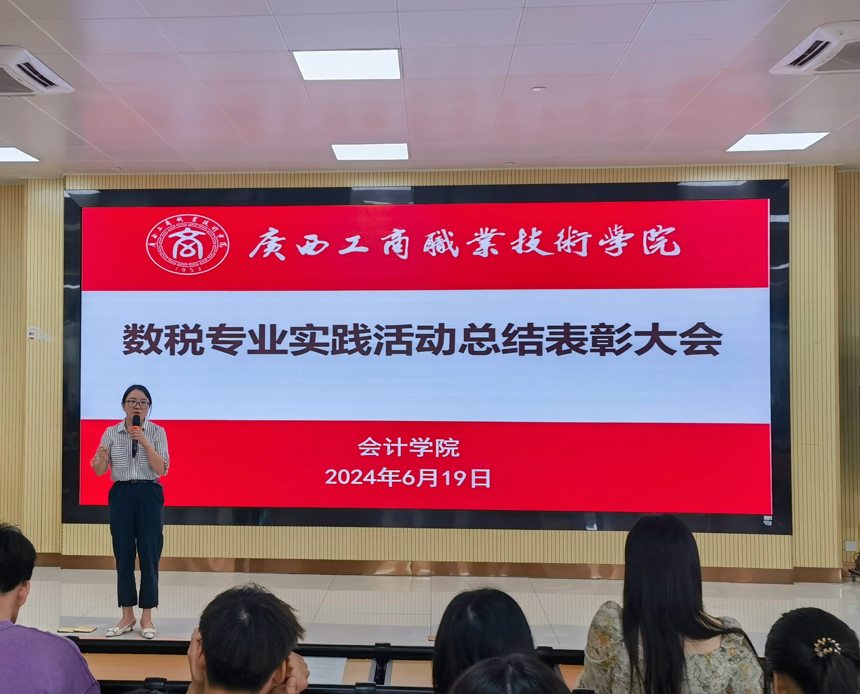 会计学院2023-2024学年第二学期财税大数据应用专业实践活动已顺利告一段落,为总结经验以及表彰先进,树立楷模,让同学们更好的领会此次专业实践活动的重要意义,2024年6月19日,会计学院在武鸣校区A3-101阶梯教室召开实践活动总结表彰大会。此次会议由黄颖老师主持,与会人员有会计学院教学副院长谭玉娥、教务科科长梁亚兵、教学秘书梁月华以及2022级财税大数据应用专业全体在校学生。