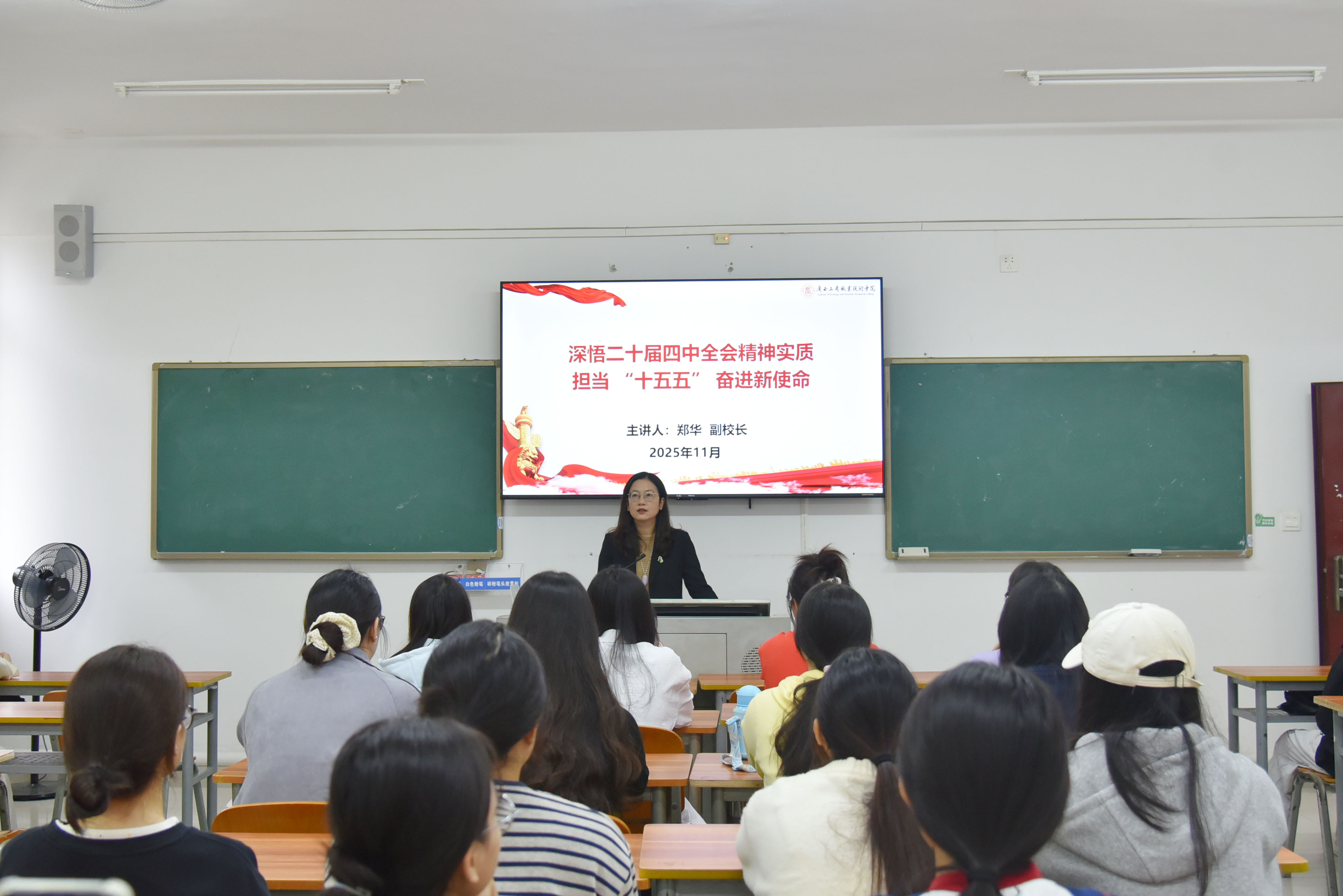 为深入学习贯彻党的二十届四中全会精神,提升思政课育人实效,2025年11月7日上午,学校副校长郑华以《深悟党的二十届四中全会精神实质 担当“十五五”奋进新使命》为主题,为视觉2402班同学讲授思政专题课。马克...