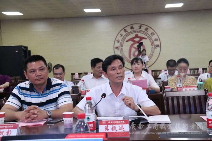 6月22日下午,广西工商职业技术学院在鹏飞校区会议厅举办学院发展座谈会。广西工商职业技术学院党委书记覃武云、院长陈杰、党委副书记蒙启成、副院长李仕钦、副院长李维、副院长陈宁春出席会议,学院各部门、各单位主要负责人、校友办、各系系校友组全体人员、四个年代校友代表(毕业30年、20年、10年、今年)、 四个年代入职教师代表(入职 30 年、20 年、10 年、今年)参加会议。 座谈会由院长陈杰主持。会上,陈杰介绍了参会人员,并对返校的毕业校友代表及教师代表的到来表示热烈欢迎。紧接着,覃武云向大家简要通报学院改革发展情况,主要讲三方面情况。