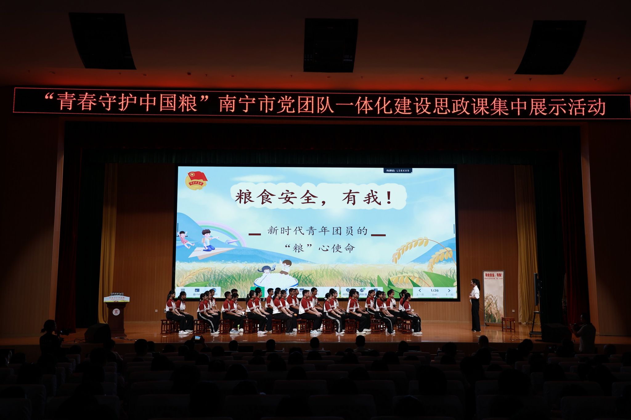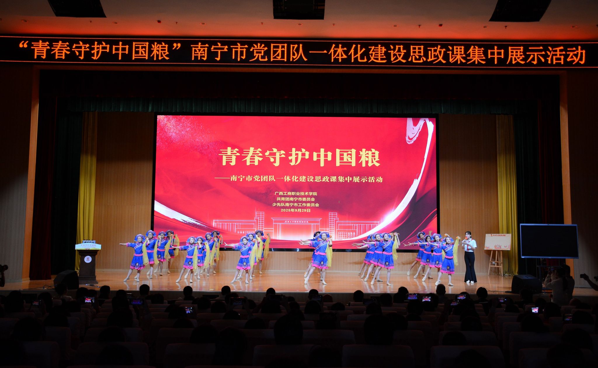 9月29日上午,以“青春守护中国粮”为主题的南宁市党团队一体化建设思政课集中展示活动在我校成功举办。本次活动由广西工商职业技术学院、共青团南宁市委、少先队南宁市工作委员会共同主办,旨在深入推动习近平总书记关于粮食安全的重要指示精神在青少年群体中落地生根,积极探索贯通“小学—中学—大学”的党团队一体化思政育人新模式,强化广大青少年对粮食安全战略的认知与责任感。