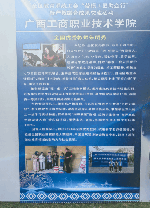 12月18日,由自治区教育工会主办的全区教育系统工会“劳模工匠助企行”暨产教融合成果交流活动在广西机电职业技术学院举行。本次活动旨在推广劳模精神、工匠精神,深化产教融合、校企合作,促进职业教育与产业需求紧密对接。我校全国优秀教师、无党派人士朱明秀教授教学成果入选全区教育系统工会“劳模工匠助企行”暨产教融合成果交流展。
