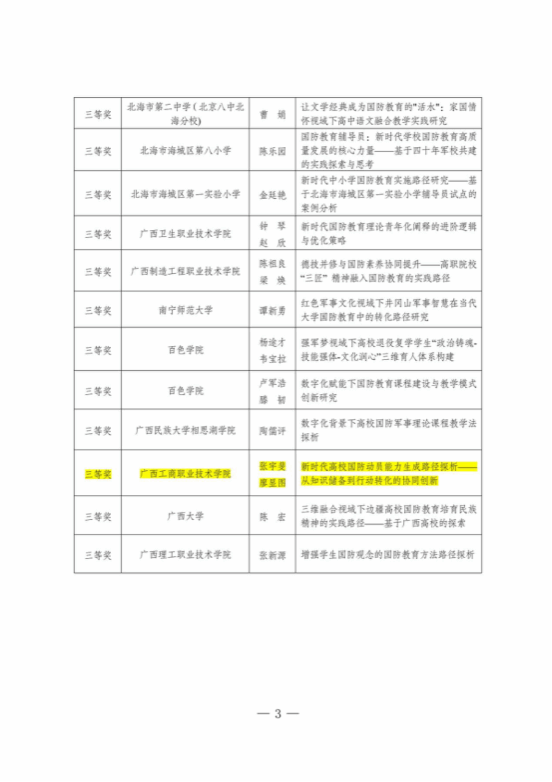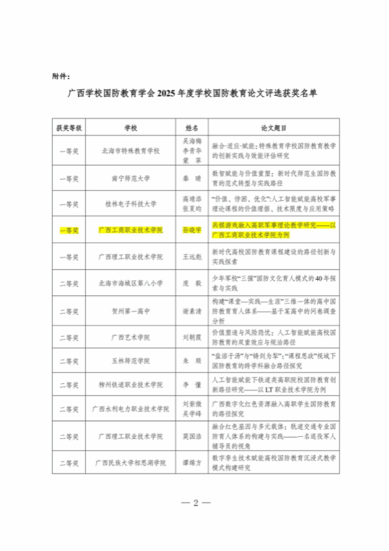 近日,广西学校国防教育学会公布了2025年度学校国防教育论文评选结果,我校教师孙晓宇凭借论文《兵棋游戏融入高职军事理论教学研究——以广西工商职业技术学院为例》荣获一等奖,张宇斐、廖显图老师的论文《新时代高校国防动员能力生成路径探析——从知识储备到行动转化的协同创新》获三等奖。这一成绩充分展现了我校在国防教育领域的创新实践与理论研究实力,为推动全区国防教育高质量发展提供了宝贵经验。