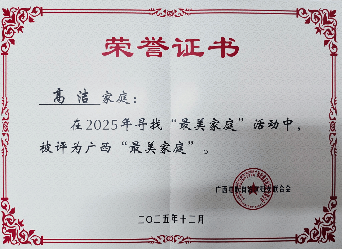 近日,2025年广西最美家庭名单正式发布,99户家庭获此殊荣。我校教师高洁家庭荣获广西“最美家庭”称号。