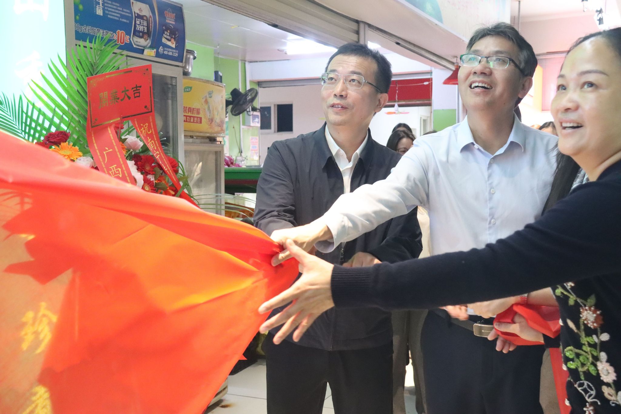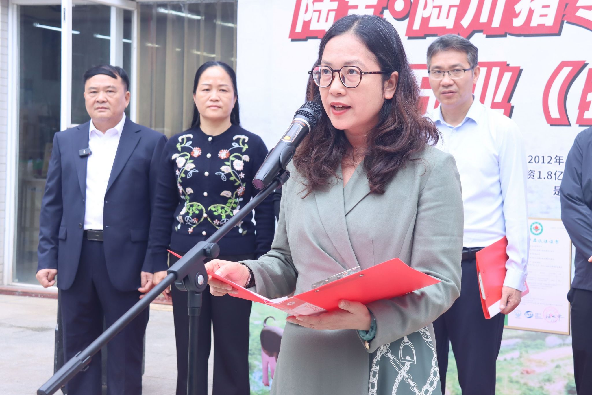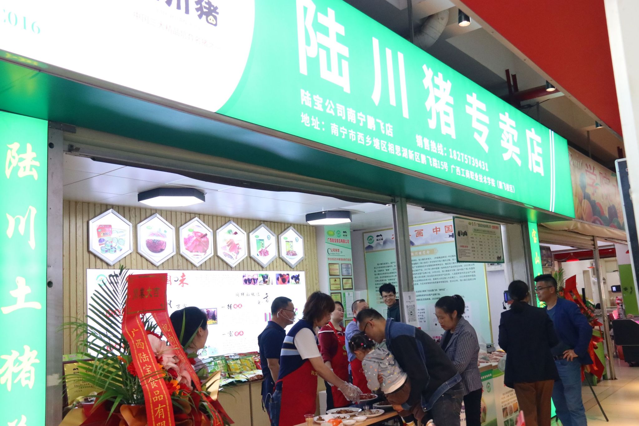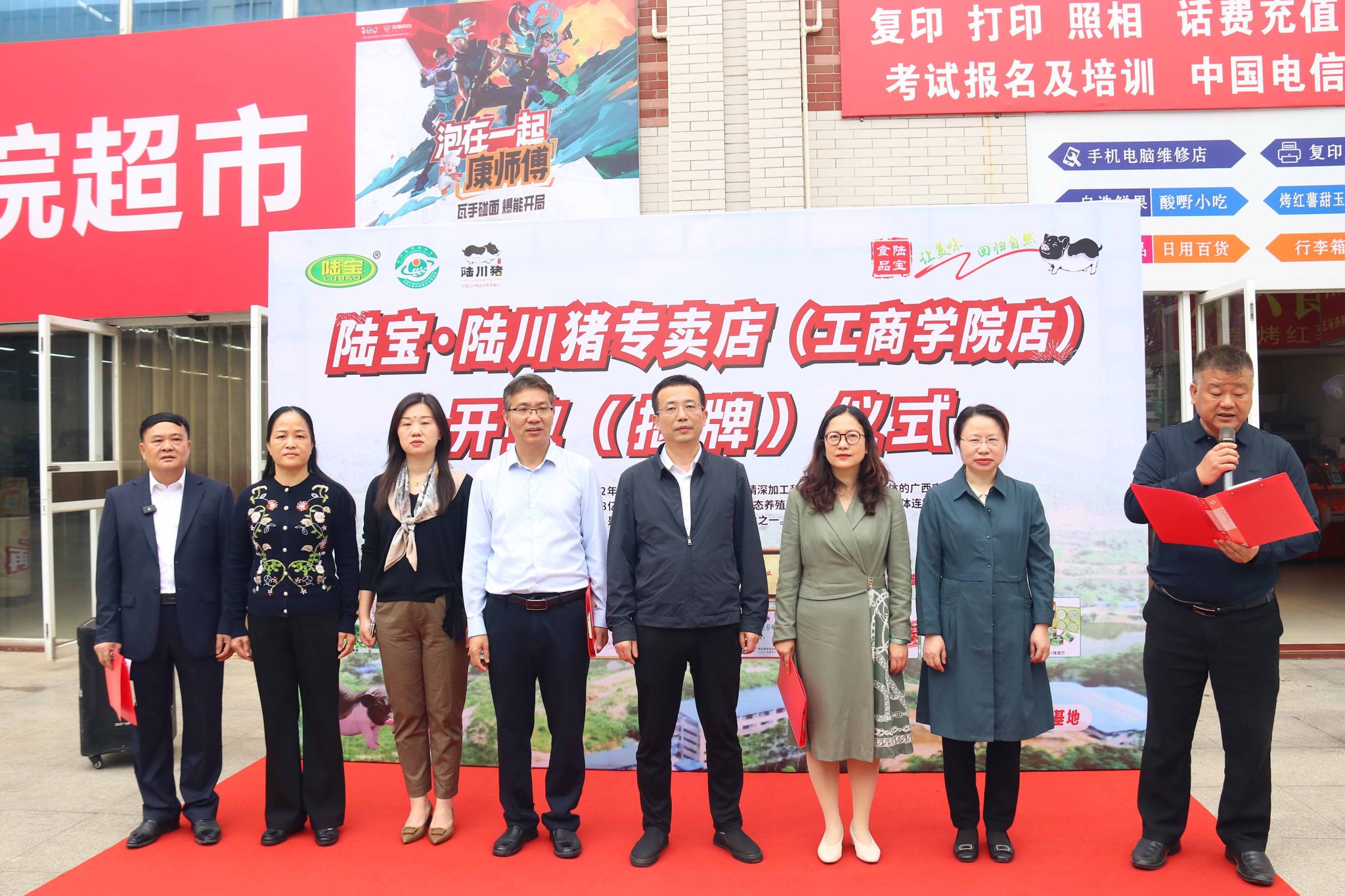 仪式由陈谨主持。在现场热烈的掌声中,刘进、郑华、林雯、陈谨、谢帆、李依林共同为陆川猪专卖店揭牌,宣告专卖店正式开业。