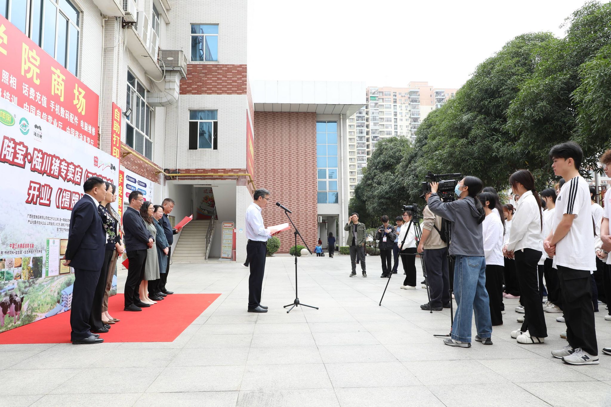 郑华在仪式上发表讲话,她指出,陆川猪专卖店入驻校园是校政企三方携手、优势互补的首个硕果,也是学校深化产教融合、服务地方产业、助力乡村振兴的生动实践。这不仅为全校师生提供绿色、健康、优质的特色农产品,更为我校市场营销、电子商务、食品检验等专业搭建了真实的实训场景,让同学们在实践中提升技能、增长才干,实现“学中做、做中学”。期待未来更多陆川优秀企业走进校园、深化合作,校政企共同探索人才培养、产业升级、乡村振兴的新路径。