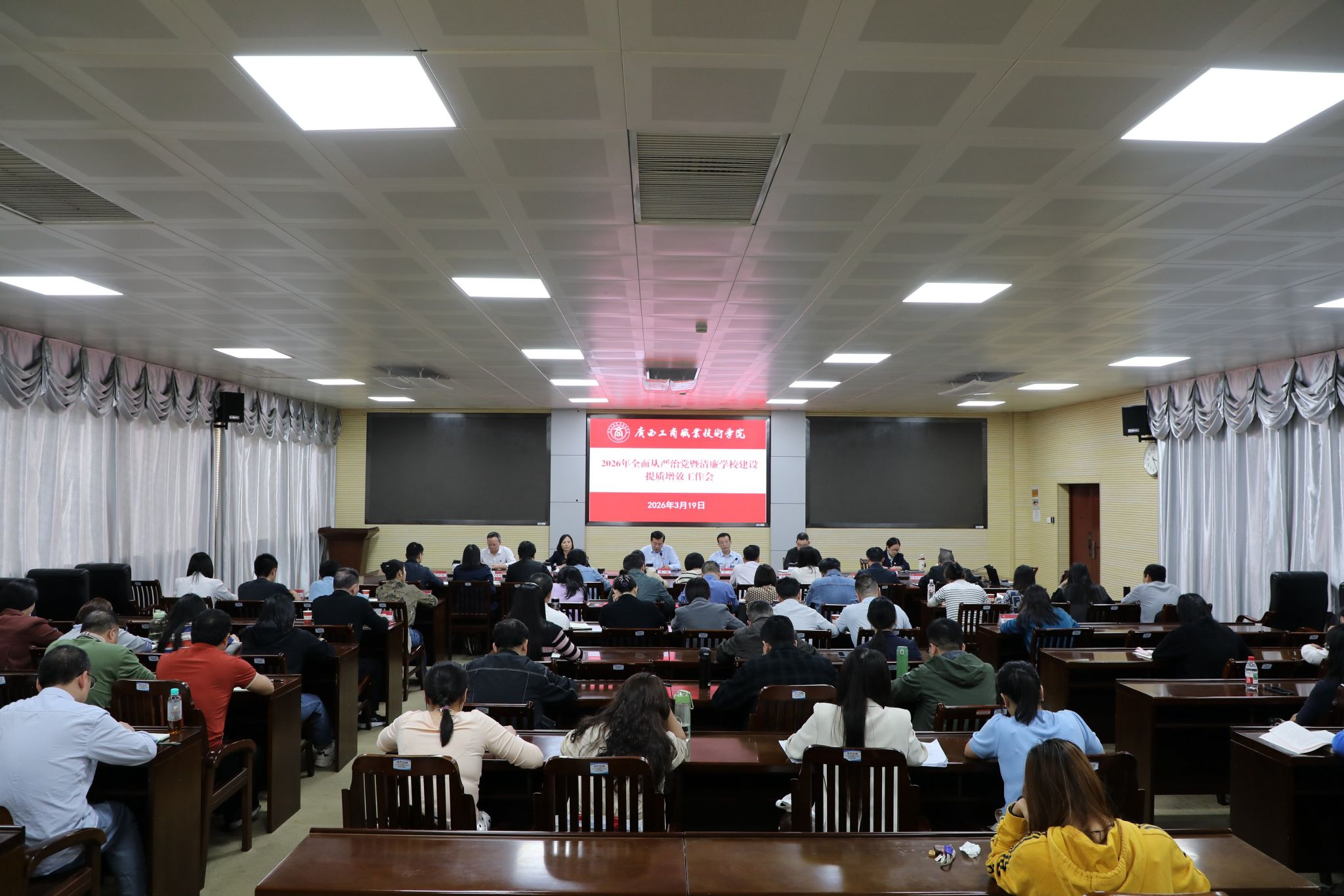 3月19日,学校在鹏飞校区召开2026年全面从严治党暨清廉学校建设提质增效工作会。学校党委书记李维在会上发表讲话,党委副书记、校长刘进主持会议,党委副书记、纪委书记韦云凤对学校2026年纪检监察工作作工作部署。