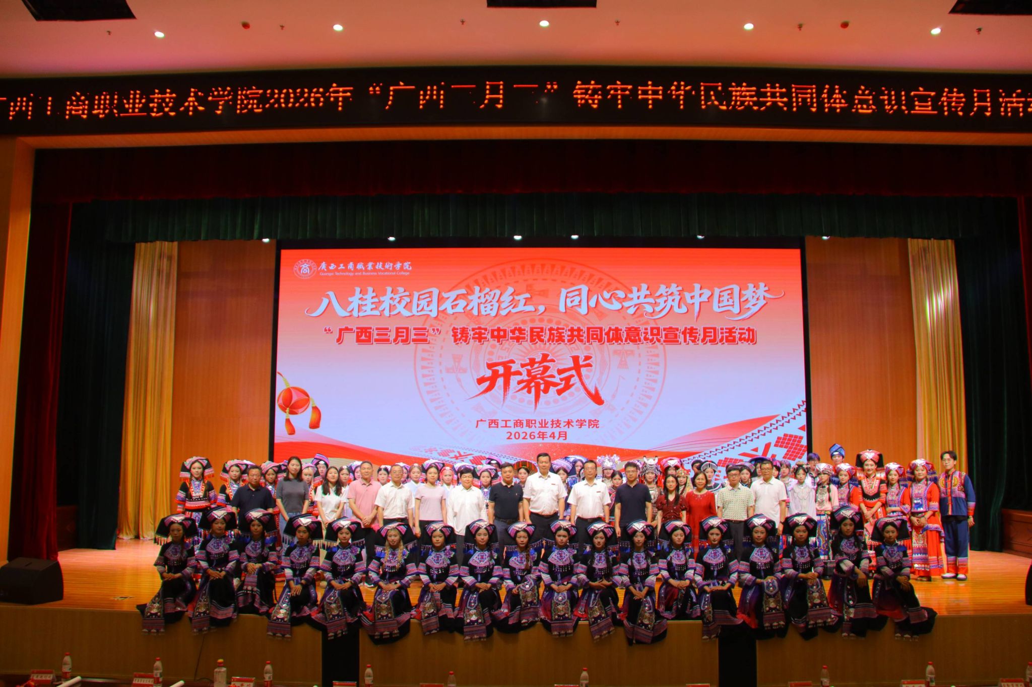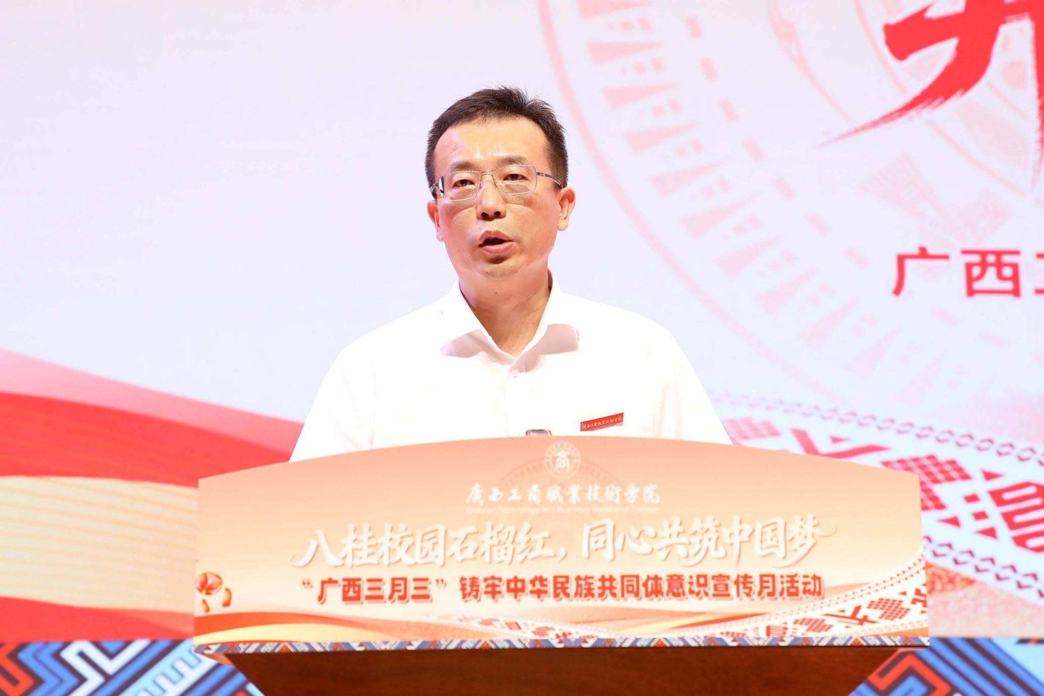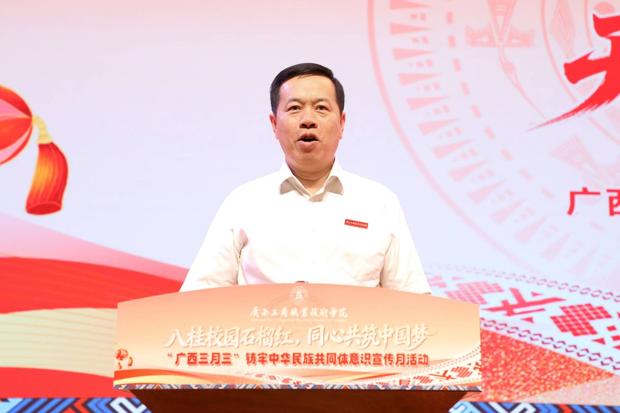 刘进在致辞中表示,十四届全国人大四次会议审议通过《中华人民共和国民族团结进步促进法》,为新时代民族团结进步事业提供了坚实法治保障;自治区党委出台《广西建设铸牢中华民族共同体意识示范区行动方案》,扎实推进铸牢中华民族共同体意识示范区建设,学校始终紧跟中央、自治区步伐,坚决贯彻落实各项决策部署。刘进强调,一直以来,学校党委高度重视民族团结进步教育,始终把铸牢中华民族共同体意识贯穿办学治校、教书育人全过程,不断探索将民族文化传承与立德树人深度融合的实践路径,以实际行动服务全区民族团结进步事业发展。刘进提出,“广西三月三”铸牢中华民族共同体意识宣传月活动是我们学校一年一度的盛事,今年精心准备了形式多样的文化活动,希望各族师生在活动中加强交往交流交融,像石榴籽一样紧紧抱在一起,不断铸牢中华民族共同体意识,让民族团结之花在校园绚丽绽放。