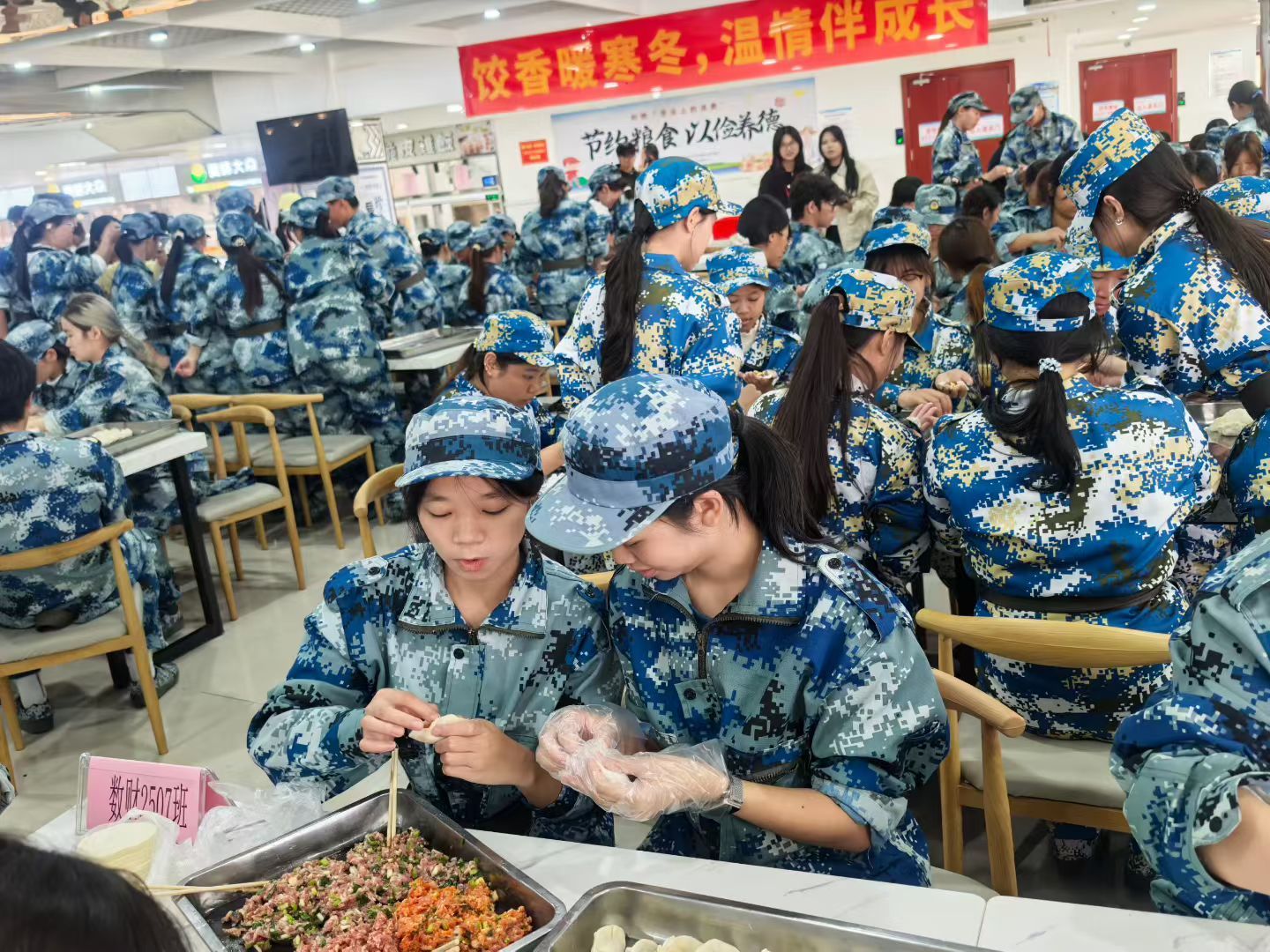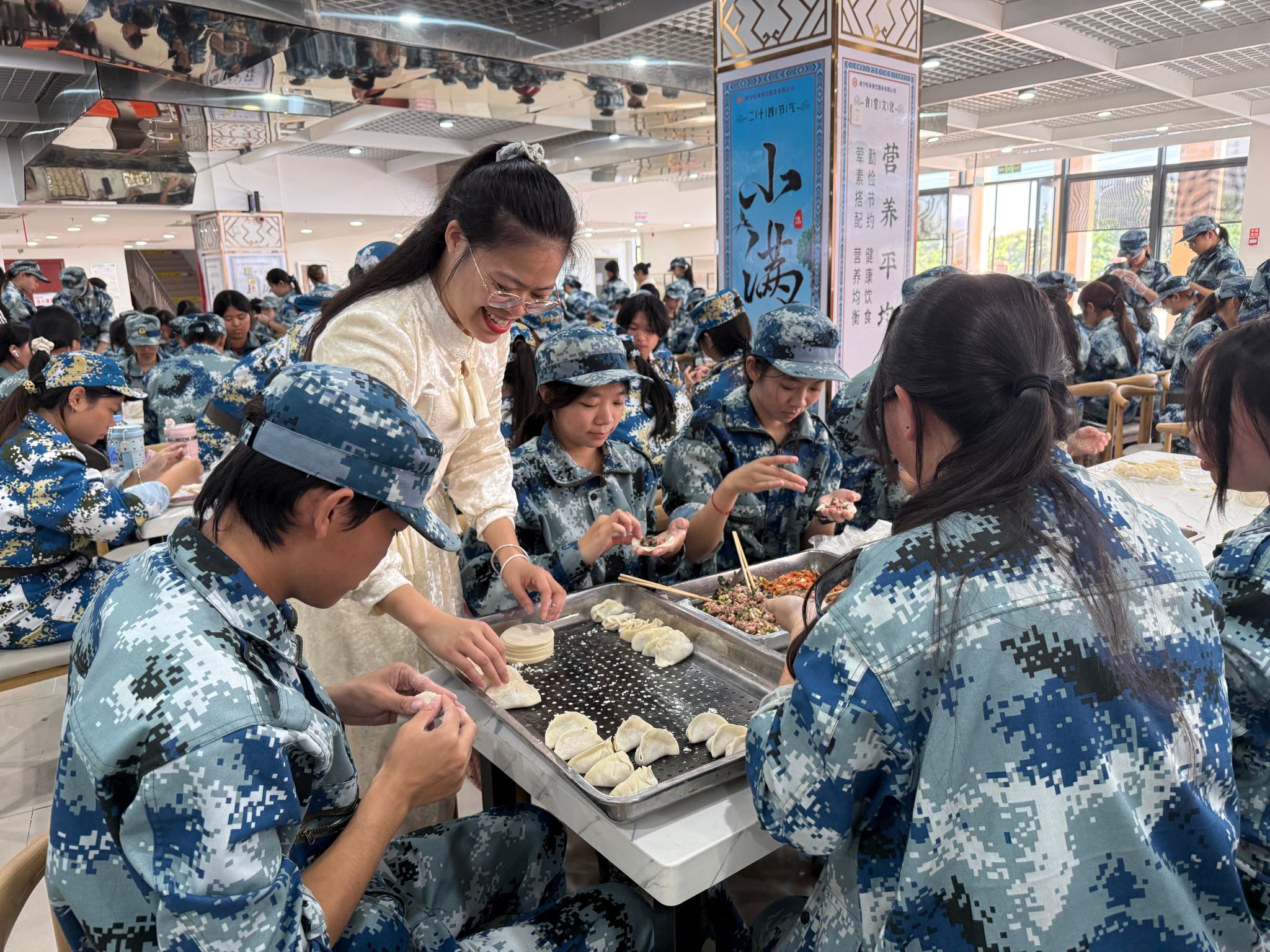 食堂的长桌前,是财金学院一幅崭新的青春画卷。2024级的学长学姐与2025级的新生们汇聚一堂,他们的身份从“同学”暂时转变为“战友”和“师徒”,老生手法娴熟,耐心指导;新生现学现卖,创意百出,那一个个或精致或“抽象”的饺子,不仅是劳动成果,更是共同协作的见证。尤其对军训的大一新生而言,这仿佛是一场没有口令的协同“作战”,他们将刻入肌肉记忆的团队协作,自然而然地融入了这次温暖的集体创作。