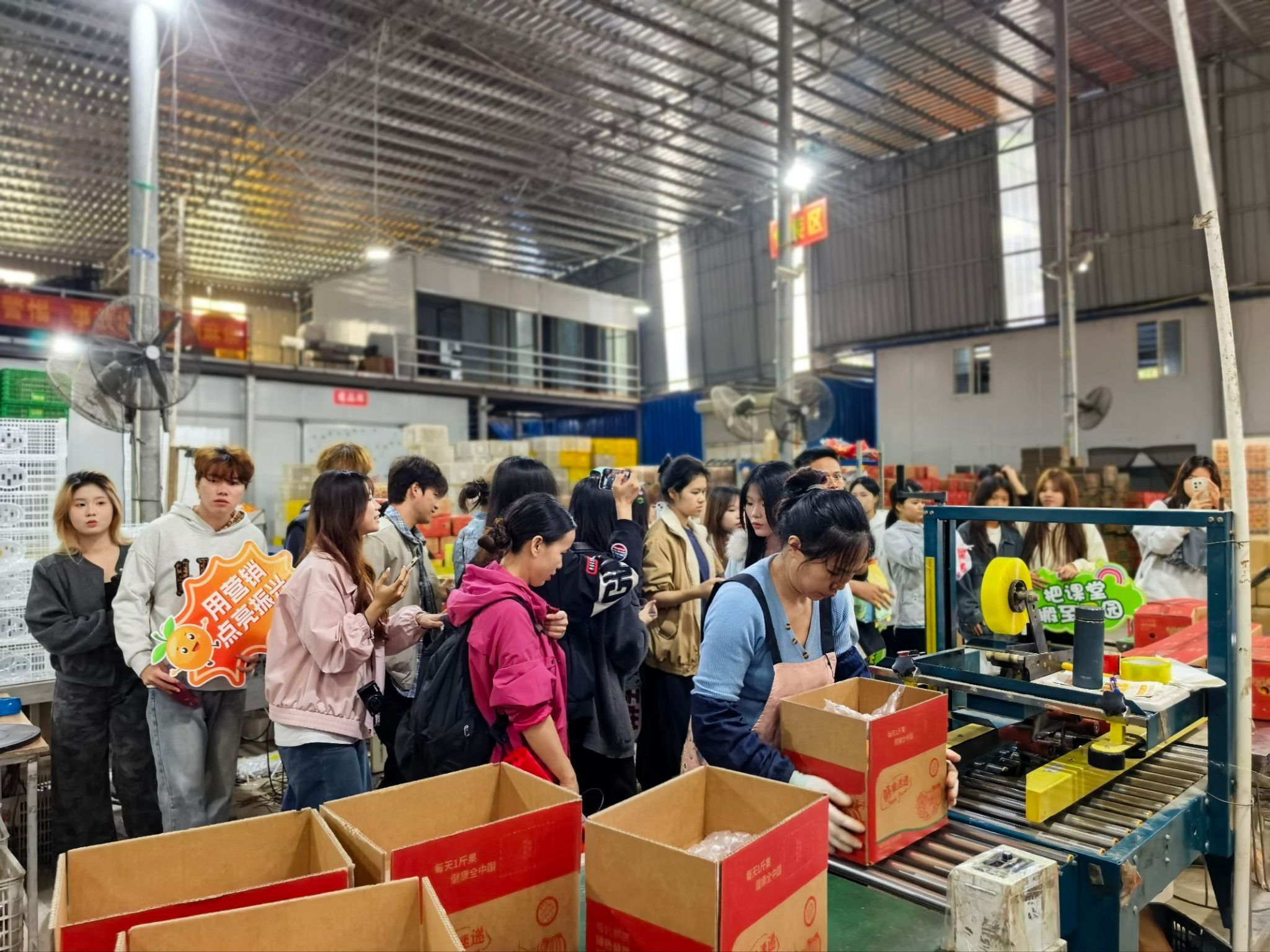 师生一行先后走访了鑫天兰农业有限公司果园基地与广西鸣鸣果业有限公司果园基地,实地考察沃柑种植环境、采摘流程与品控体系。企业负责人详细介绍了沃柑的品种特点、种植技术与品牌发展历程,并带领师生深入果园和供应链工厂,讲解果品分级、包装与供应链运作模式。学生们结合专业学习需求,重点围绕目标客群、产品卖点、品牌打造、市场推广等内容展开实地访谈与素材采集,为后续撰写市场调研报告、创作推广内容积累了一手资料。