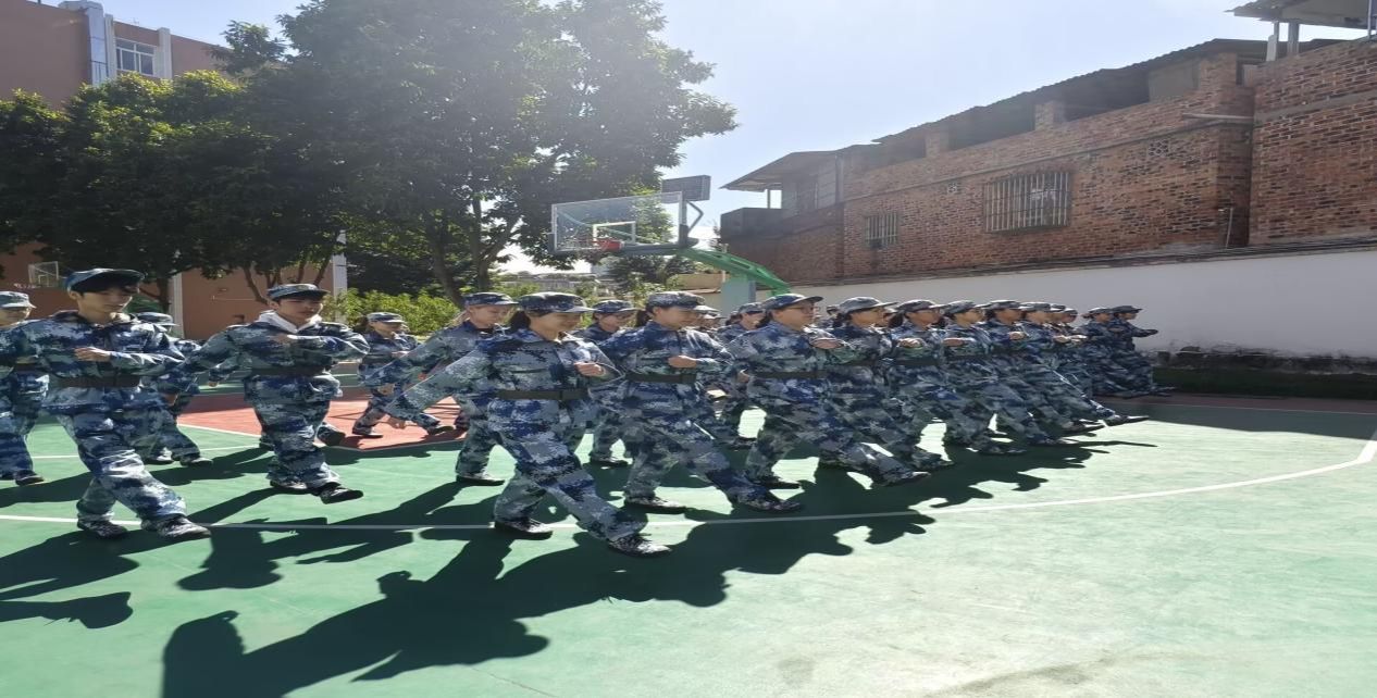 这一天,是沉淀与巩固的时刻,同学们开始复习前四天的训练内容。同学们练习齐步走与齐步踏步走时,整齐的脚步声在篮球场上回荡,气势如虹;在练习停止间转法时,每一次转体、靠脚都力求干净利落,发出清脆有力的声响,展现着令行禁止的纪律性。在正步走的训练中,同学们的腿绷得笔直,定格在空中,手臂摆动有力、定位准确,咬牙坚持。敬礼时,大家抬起右臂,目光随之投向指尖的方向,眼神里褪去了平日的稚气,充满了坚定与庄重。