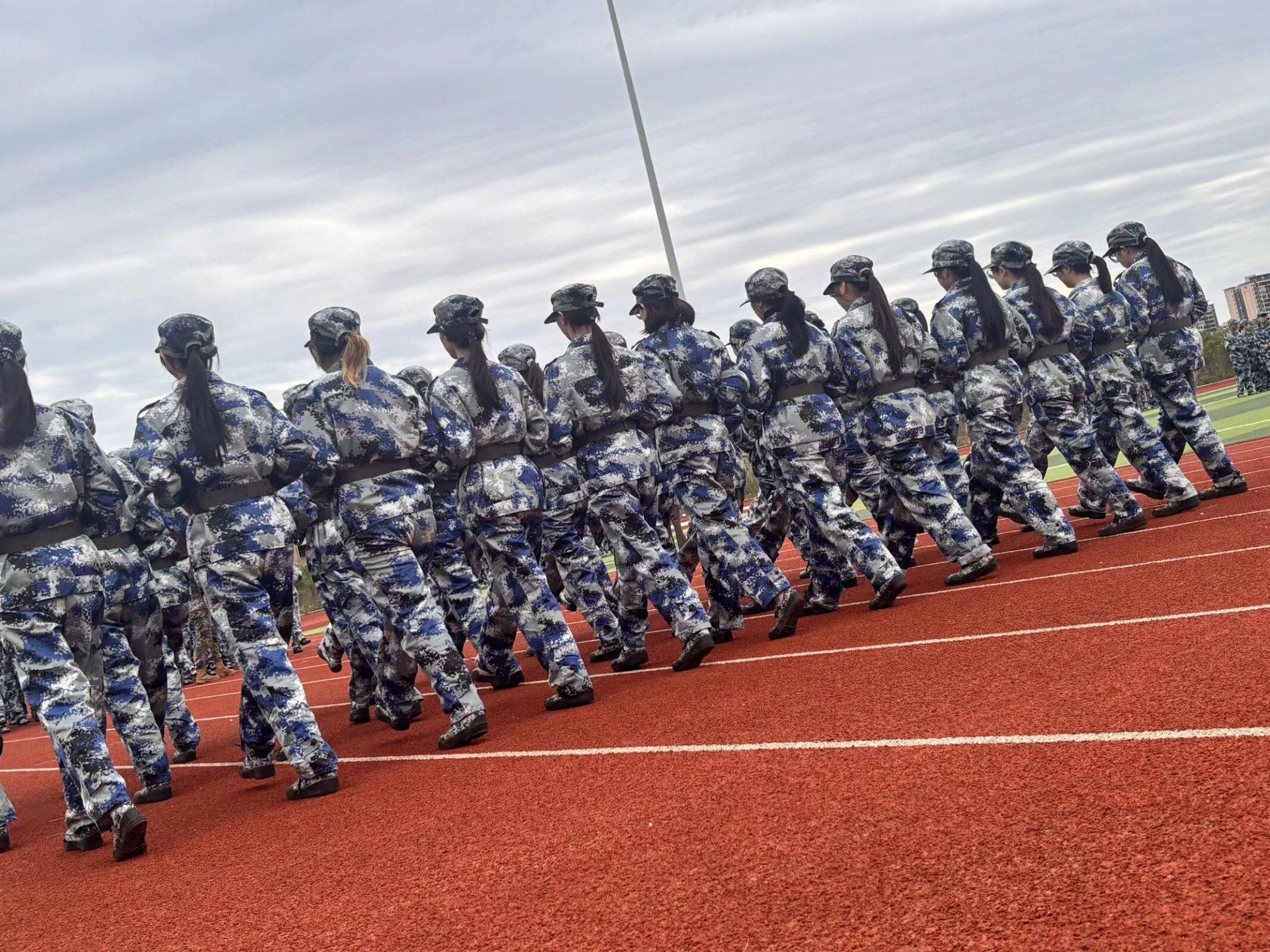齐步走的训练,是对“默契”二字最直接的打磨。“摆臂要直、步幅要稳、节奏要齐”,教官的口令落在风里,同学们的手臂同时划出利落的弧线,帆布鞋叩击红色塑胶跑道的声响,从起初的错落渐渐汇成密不透风的鼓点。有人悄悄调整步频跟上身旁的同学,有人攥紧的掌心沁出薄汗,却始终把腰背挺成笔直的线——迷彩服的蓝白纹路在队列里起伏,像一群振翅欲飞的雁阵。