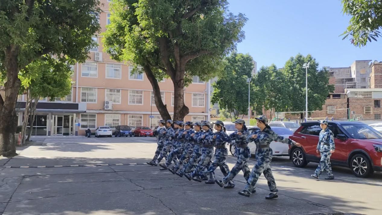 分组训练不仅让教学更具针对性,也激发了同学们的团队意识与互助精神。教官穿梭于各小组之间,逐一纠正动作细节——从手臂的摆动幅度到腿部的发力方式,从身体的平衡控制到整体的节奏统一。同学们在小组内互相观摩、彼此提醒,有的负责喊口令,有的负责检查动作,有的主动分享保持平衡的技巧……训练场上洋溢着浓厚的协作氛围。
