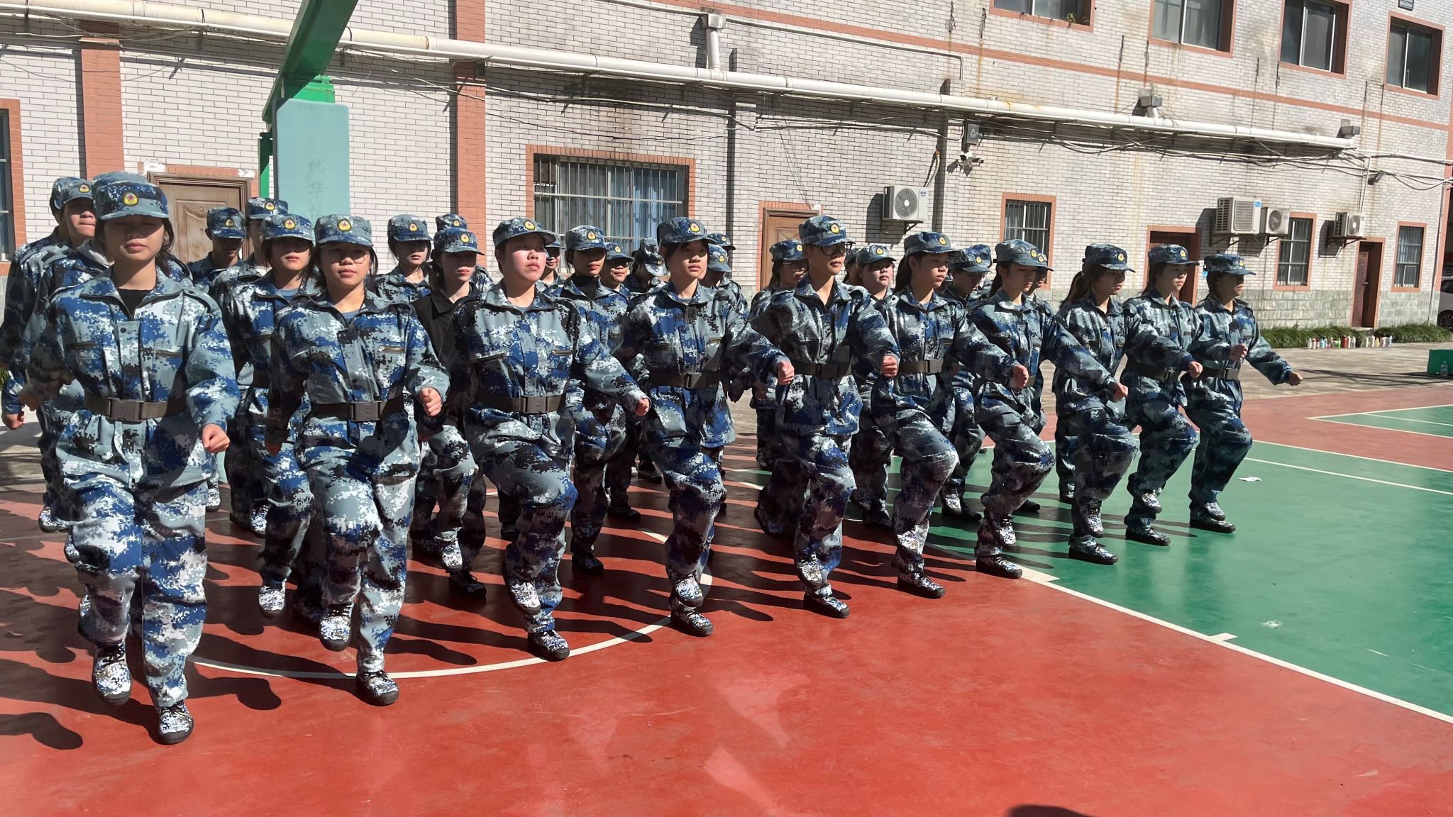 “一、二、三、四!”嘹亮口号划破长空,同学们身着戎装,摆臂如翼振,落脚如雷落,每一步都精准踩在节奏上,每一排都整齐如刀切。阳光铺陈训练场时,酸痛的腿脚挡不住前行的脚步,规范的姿态在反复练习中愈发标准。教官逐人纠正姿势,同学们相互鼓劲打气,30°的踢腿高度、45°的摆臂幅度,在千百次练习中刻进肌肉记忆。这不仅是步伐的校准,更是成长的淬炼。