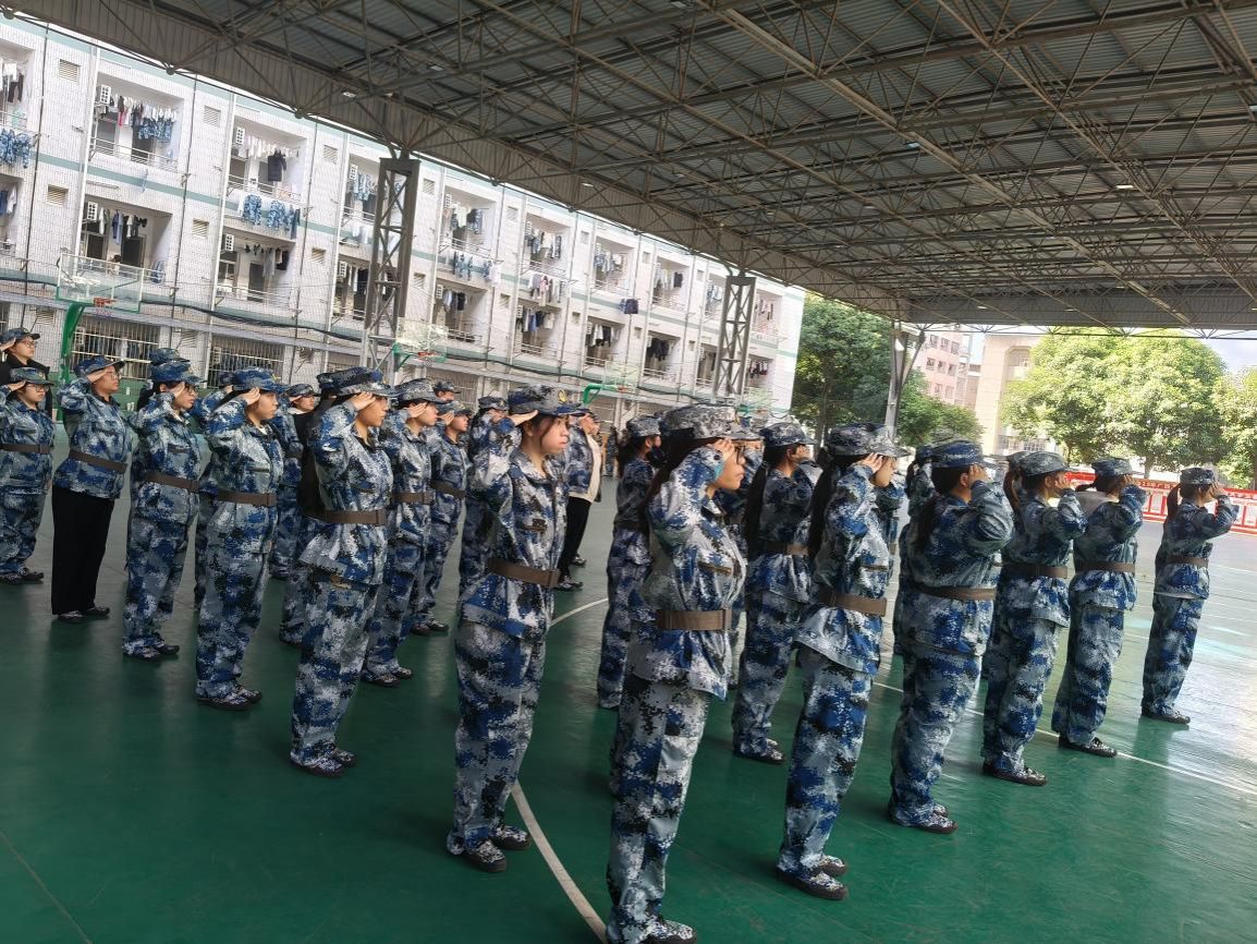 2025年11月23日,在晴朗的天空下,同学们身着蓝灰色迷彩服,在风雨场上整齐列队,构成了一道亮丽的风景线。他们目光坚定,身姿挺拔,右臂整齐划一地举起敬礼,展现出青春的朝气与铁的纪律。