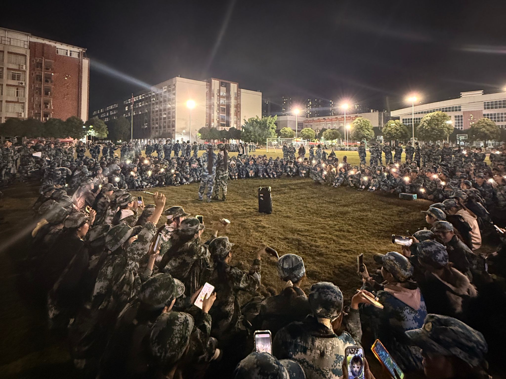 夜色裹住操场时,教官把我们圈成了大圈。军歌的调子刚起时还有人跑调,可越唱越齐,最后连晚风都裹着“向前向前向前”的旋律。有人举着手机闪光灯晃成星海,其他连队的歌声撞过来,我们扯着嗓子接,笑喊声裹在夜里。看那些晃来晃去的迷彩帽、亮成一片的屏幕光,忽然觉得这夜的凉,早被裹在歌声里的热气烘得没了踪影。