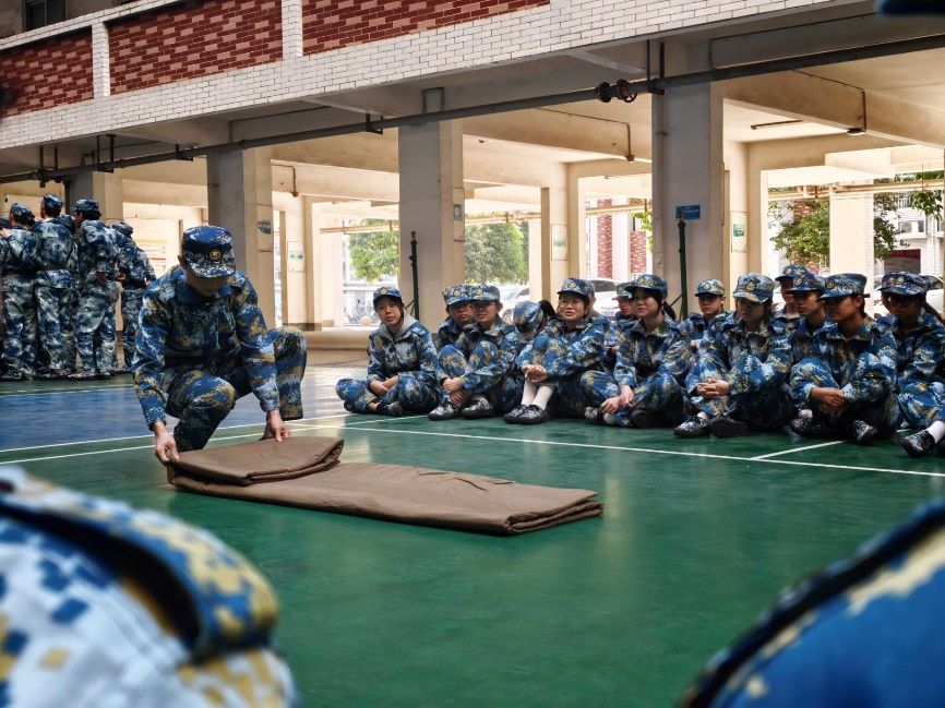宿舍区内务训练同步展开。在教官的细致指导下,同学们认真学习被褥折叠技巧。铺平、压实、捏角、塑形,每一个步骤都凝聚着耐心与专注。经过反复练习,松软的被子渐成方正“豆腐块”,随意摆放的衣物也变得整齐划一。这不仅是技能的掌握,更是细致作风的养成。