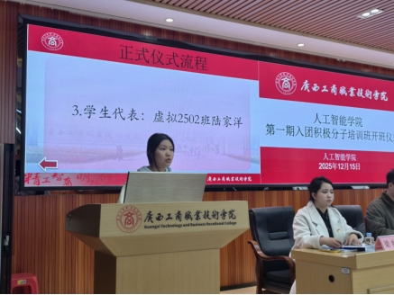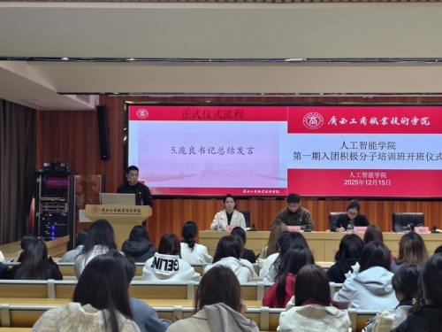 为加强青年思想政治引领,扎实做好团员发展工作,2025年12月15日,人工智能学院第一期入团积极分子培训班开班仪式暨首堂团课在鹏飞校区2145会议室举行。学院党总支书记庞良、副院长阙玲丽,主讲导师何文芳、李钊慧、林陈原野、刘坤及2025年秋季学期全体入团积极分子参加仪式。活动由学院团委负责人梁纳老师主持。