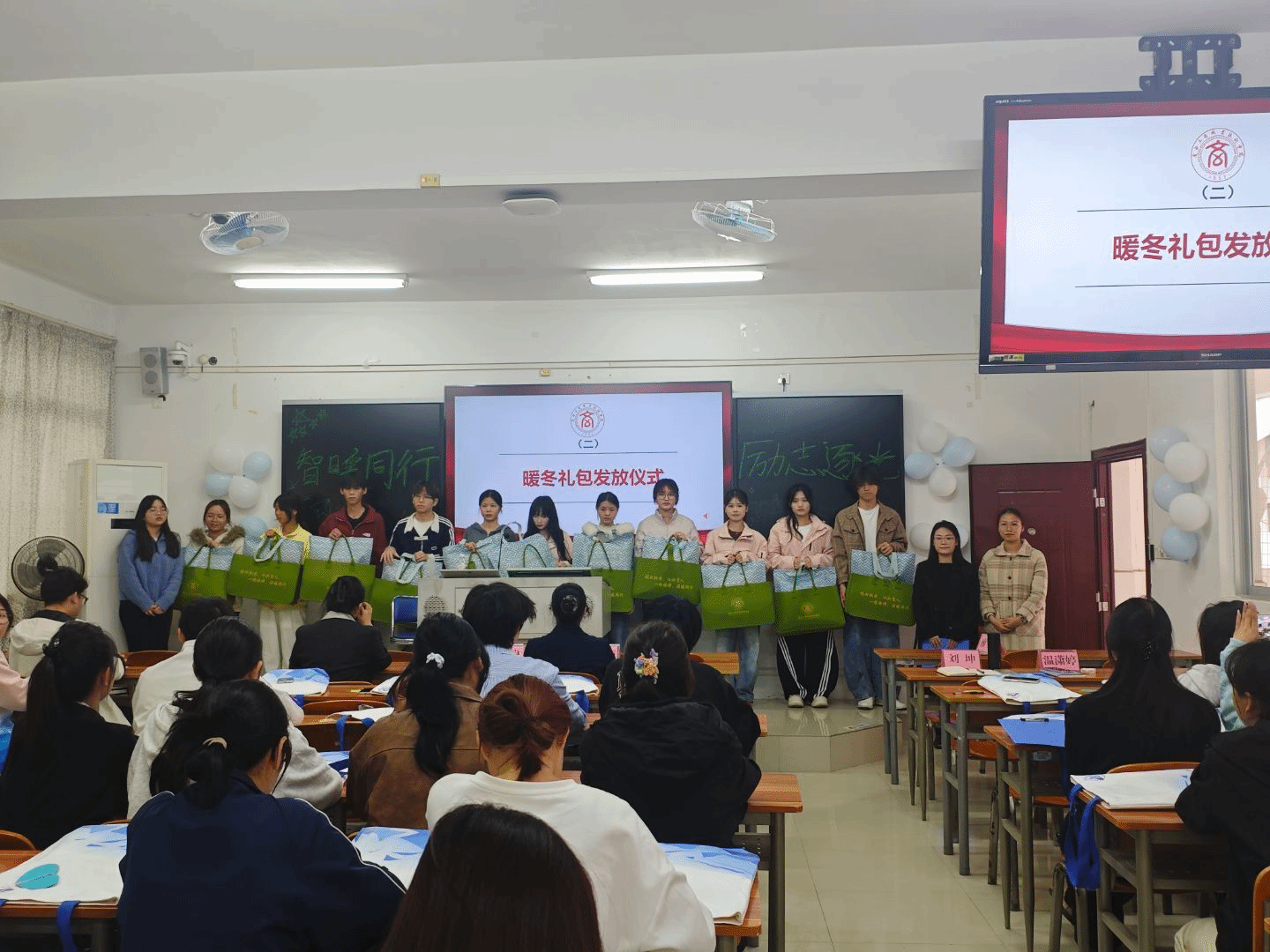 在礼包发放环节,阙玲丽副院长阐述了扶困、扶志、扶智相结合的资助育人理念,勉励同学们将关怀转化为前进动力。随后,到场老师向学生代表发放了暖冬礼包。
