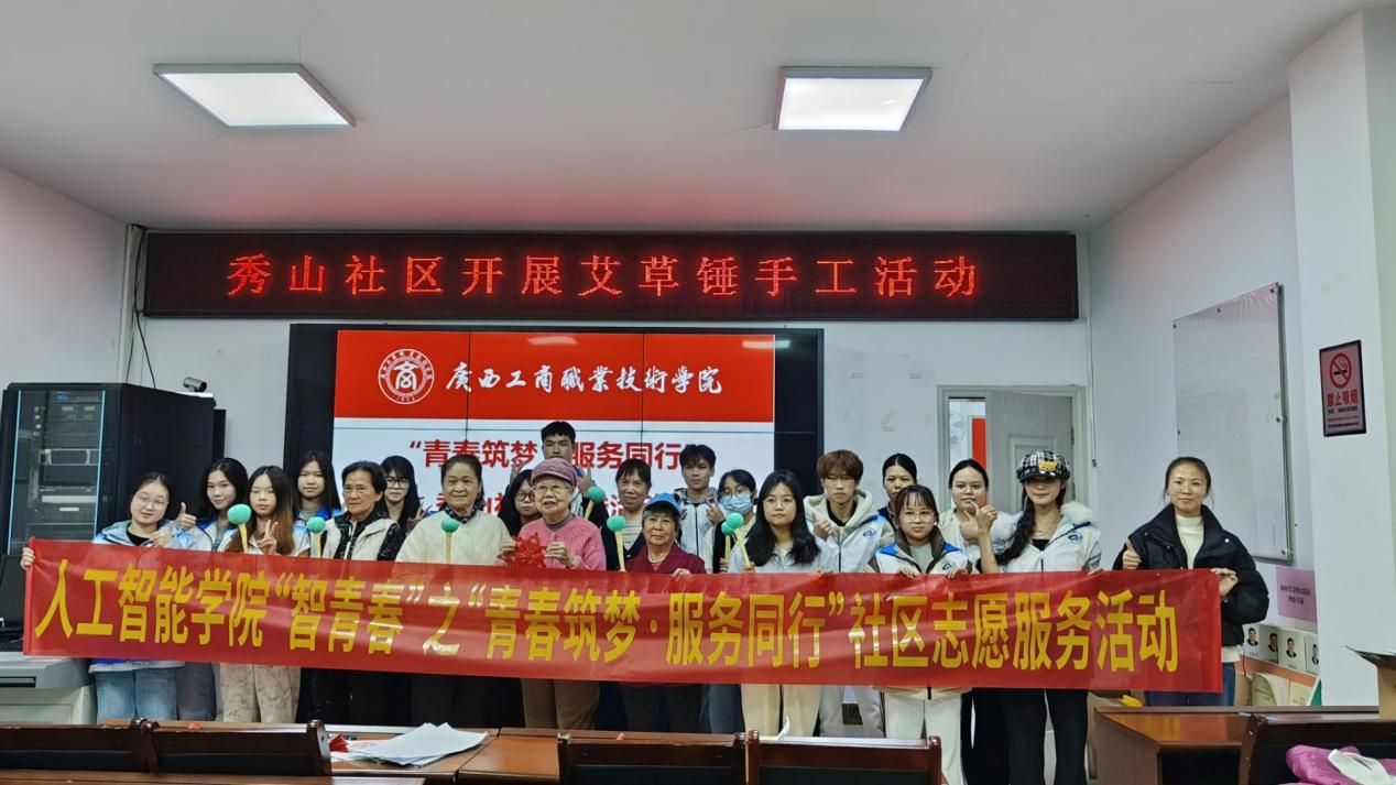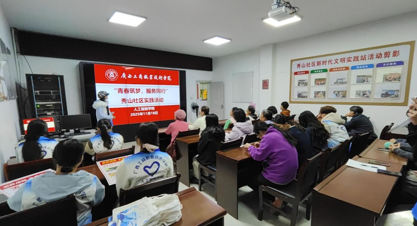 2025年11月18日,广西工商职业技术学院人工智能学院师生走进秀山社区,开展“青春筑梦,服务同行”主题实践活动。本次活动由学院辅导员刘坤老师带队,学生志愿者们通过互动教学与现场实践相结合的方式,将消防安全知识普及与非遗技艺传承融入社区居民生活。