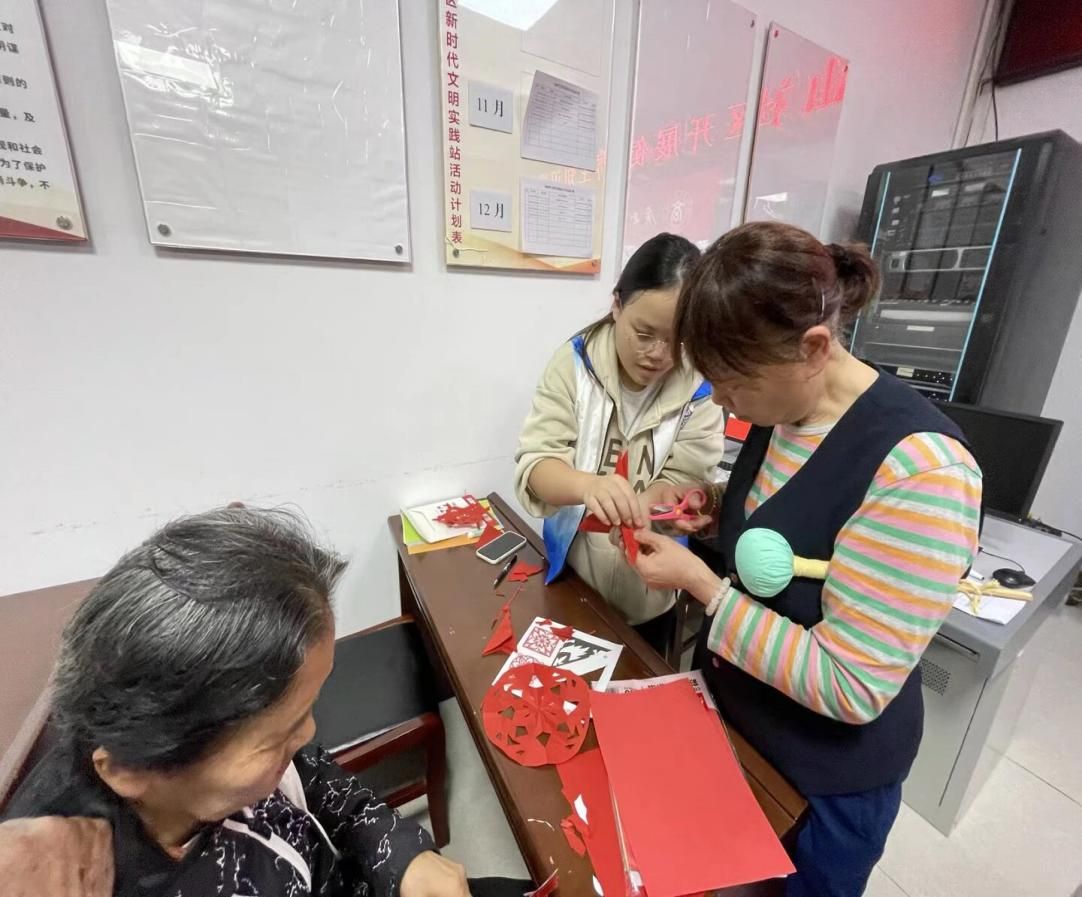 志愿者指导居民剪纸