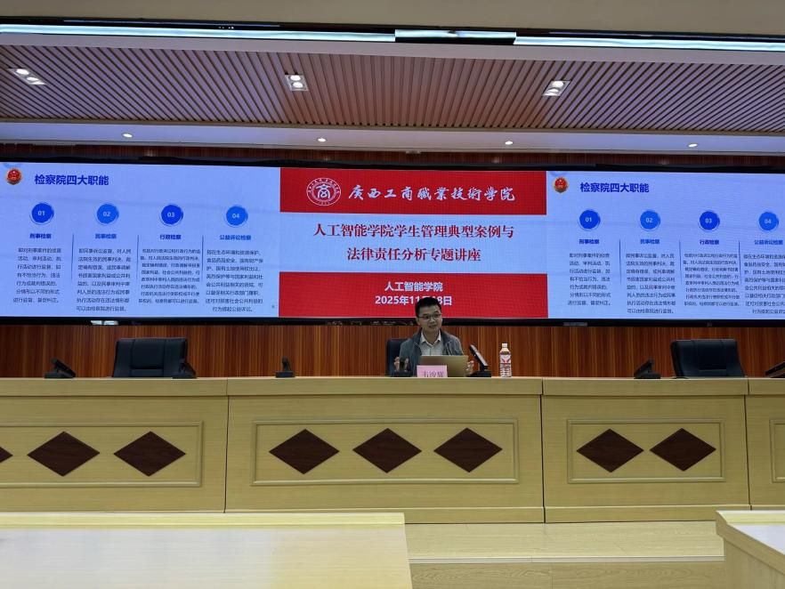 为提升辅导员队伍法律素养与学生管理服务水平,有效防范和应对学生常见法律风险,11月18日上午10:00-12:00,人工智能学院在鹏飞校区2145会议室举办《学生管理典型案例与法律责任分析》专题培训,学院全体辅导员参加。此次培训特邀南宁市西乡塘区人民检察院检委会委员、第一检察部主任韦竣耀同志主讲,韦检察官结合多年司法实务经验与真实案例,为辅导员系统解读学生管理中的法律要点与风险应对策略。